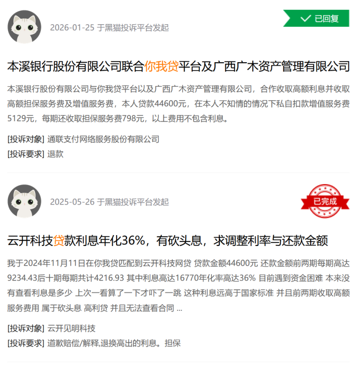 消费者投诉平台上,“你我贷”相关记录主要集中在放款或前期还款中多项服务费用,导致综合成本高于宣传口径;实际还款体验与年化利率理解存在落差;催收阶段频繁拨打通讯录内亲友电话,涉及骚扰或威胁内容。